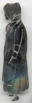This bookmark was made in the US by J. F. Fradley & Co. It is marked "Nancy Sikes", the manufacturers hallmark, Sterling, number 1863 and number 11. It is in the shape of a woman with the smaller blade as the sleeve of the woman's dress. This is part of a series of bookmarks from Dickens novels. The date is 1890 - 1936.