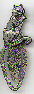 This bookmark is pewter and was made in the US in 1983. It is a cat licking his paw. The back is signed "CAT Karpita 1983 BBTC Pewter".