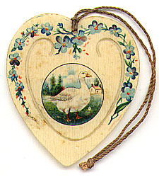 This bookmark was made in the US by an unknown manufacturer. It is a celluloid advertising bookmark for Geo. A Otis Co. of Buffalo, NY. It is in the shape of a heart with the outside decorated with blue flowers. The center blade has a picture of a duck. The date is 1905 - 1915.