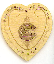This bookmark was made in the US by Baldwin & Gleason Co. Ltd. of NY. It is a celluloid religious bookmark in the shape of a heart made for the Young Peoples Society of Christian Endeavor. The date is 1905 - 1915.