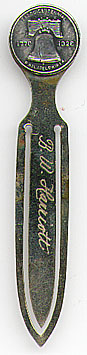 This bookmark was made in the US in 1926. It has a silver medalion on top with the Liberty Bell surrounded by the words "Sesquicentenial Phiadelphia PA. 1776 - 1926." The blades are made of chrome.