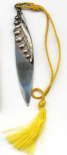 This bookmark was made in the US by an unknown manufacturer. It is marked Sterling on the back. The top blade is a figural lily of the valley flower with a gold tassel. The date is 1900 - 1910.