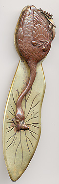This bookmark was made in Japan of copper and brass. The top clip is a stork eating a fish. The date is 1900 - 1910.