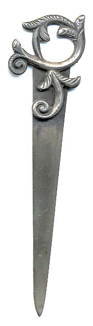 This bookmark was made in the US by an unknown manufacturer. It is marked sterling on the back. The top has an art nouveau design. There is a small blade in back. The date is 1900 - 1910.