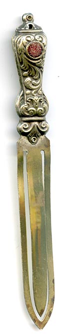 This bookmark was made in Israel by an unknown manufacturer. It is unmarked except for the printed inscription on middle blade marked Jerusalem. The top is an ornate design with a red glass jewel.
